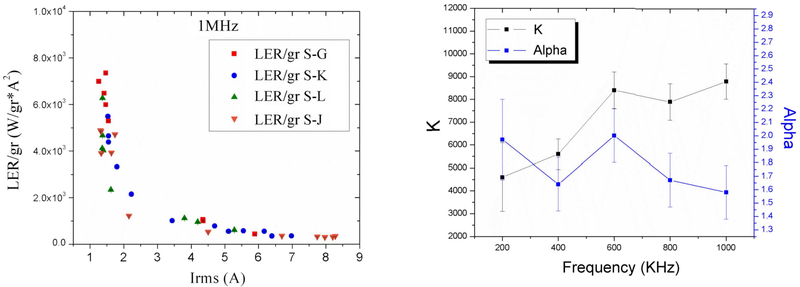 Magnetic hyperthermia mediated by superparamagnetic particles is mainly based in sinusoidal waveforms as excitation signals. Temperature changes are conventionally explained by rotation of the particles in the surrounding medium. This is a hypothesis quite questionable since habitual experimental setups only produce changes in the magnetic module, not in the field lines trajectories. Theoretical results were tested by changing the waveform of the exciting signal in order to compare non-sinusoidal signals against sinusoidal signals. Experiments were done at different frequencies: 200 KHz, 400 KHz, 600 KHz, 800 KHz and 1 MHz. Superparamagnetic Iron Oxide samples (SPION), made of magnetite (Fe3O4) and suspended in water (100 mg/ml), were used. Magnetic field strength varies from 0.1±0.015 KA/m to 0.6±0.015 KA/m. In this study was observed that the power loss depends on the applied frequency: for 1 to 2.5 RMS current the responses for each signal are part of the higher section of the exponential function, and for 3.5 to 8 RMS current the response is clearly the decrement exponential function’s tale (under 1× 103 LER/gr).